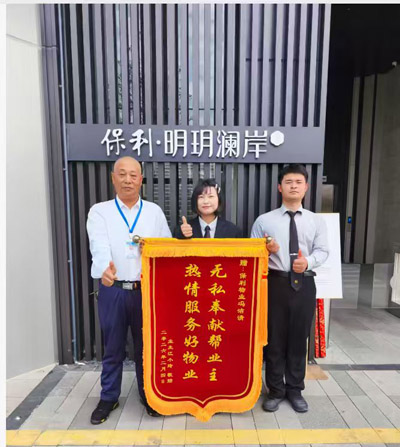 深圳市坪山區碧嶺街道保利明玥瀾岸花園業主贈送無私奉獻幫業主、熱情服務好物業錦旗給予我司鐵保宏泰深圳保安公司安保物業馮潔清同志。